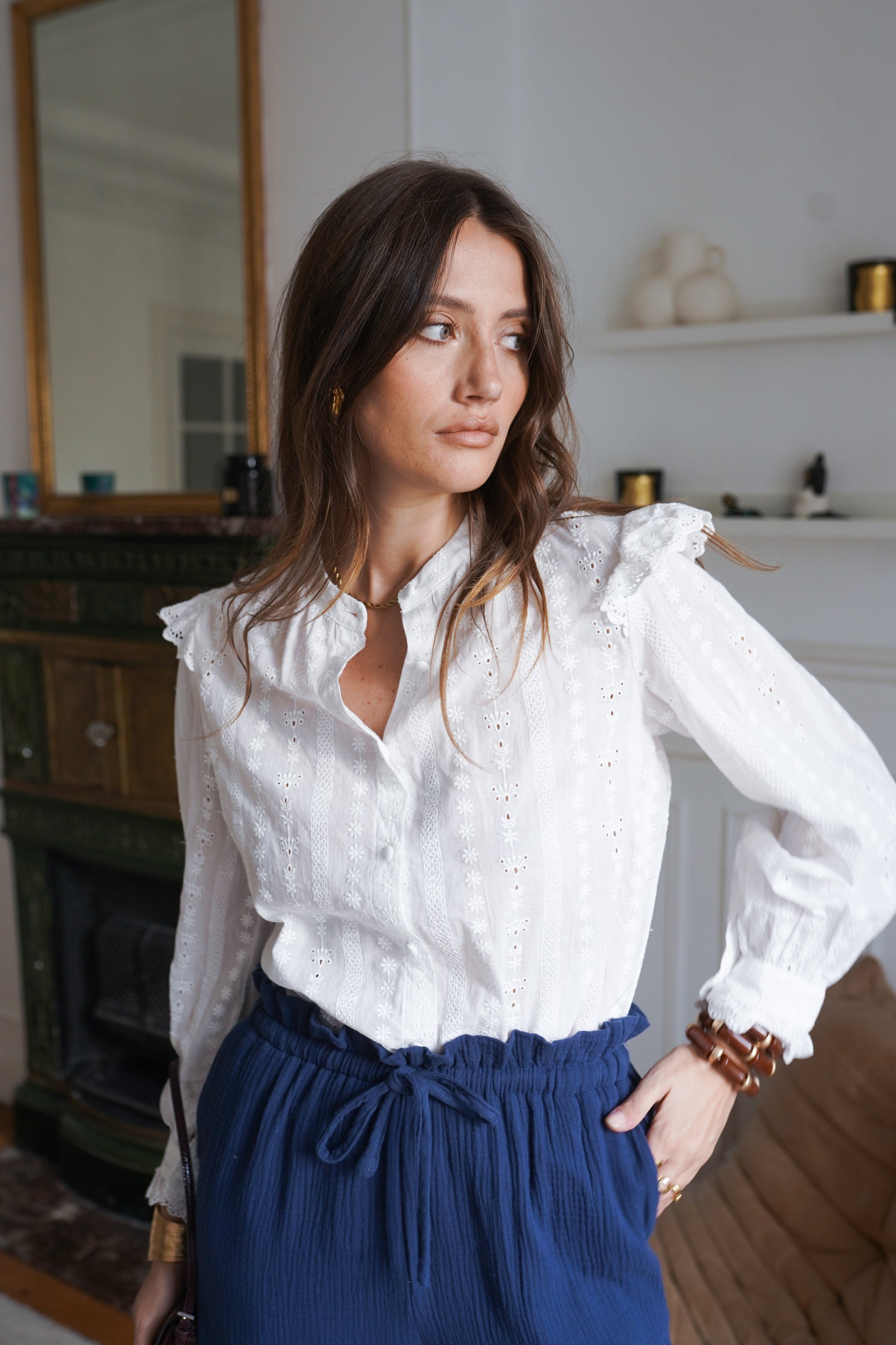 Camisa branca com bordados, com detalhe de folhos nos ombros.